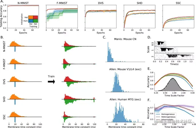 研究发现,时间常数的异质性对那些训练数据集的性能产生了深远的影响,其中信息在输入尖峰的精确时间中编码。并且证明了该结果是由于异质性。