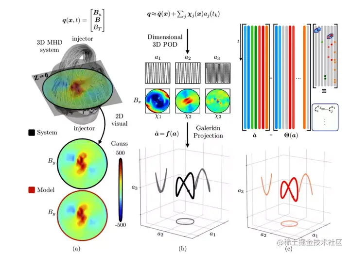 图示:填充等离子体模型层次结构较低层级方法:(a) 收集数据,(b) 执行基于投影的模型简化, (c) 使用物理约束系统识别发现数据驱动模型。(来源:论文)