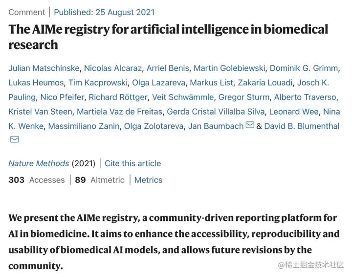 由德国、丹麦、以色列、奥地利、荷兰、比利时、巴西、西班牙多所大学的专家学者组成的国际研究团队提出了 AIMe 生物医学研究人工智能注册表(registry)。