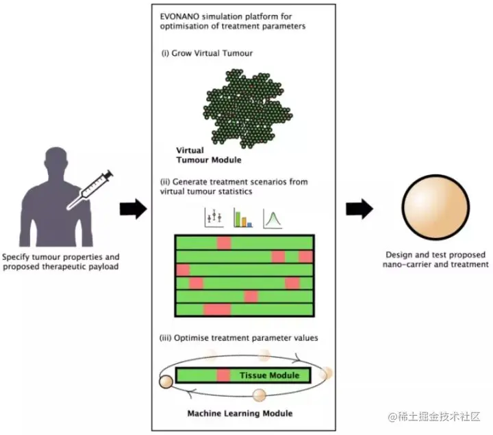 研究人员展示了 EVONANO 平台,用于纳米药物的发展,并应用于抗癌治疗。该工作旨在减少开发纳米颗粒设计所需的时间和成本。EVONANO 包括一个模拟器,用于生长肿瘤、提取代表性场景,并通过这些场景模拟纳米粒子传输,以预测纳米粒子分布。