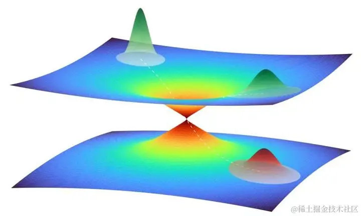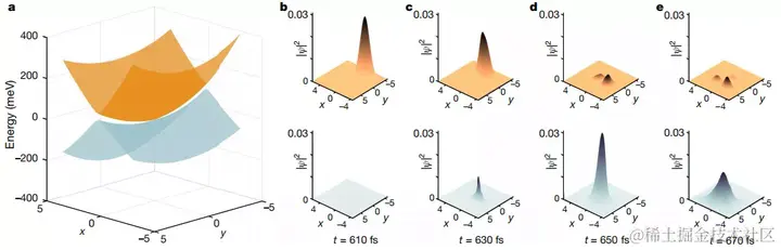 两个势能面之间锥形交叉点附近的量子波包的图示。