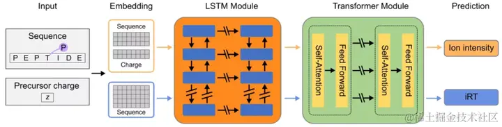研究人员开发了一个模块化深度网络,由三个主要子网络组成:用于编码肽的循环网络;用于改进肽表示的 Transformer 网络;用于预测碎片离子强度或索引保留时间 (iRT) 的回归网络。