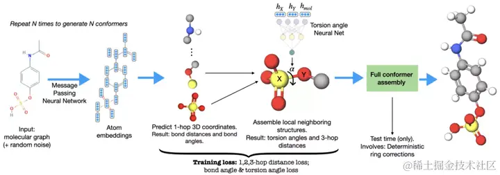 利用消息传递神经网络 (MPNN) 的强大功能来捕获局部和全局图信息,预测局部原子 3D 结构和扭转角,避免几何自由度的不必要的过度参数化(例如每个非末端键一个角度)。这种局部预测对于训练损失计算以及完整的确定性一致性组件(在测试时)都足够了。