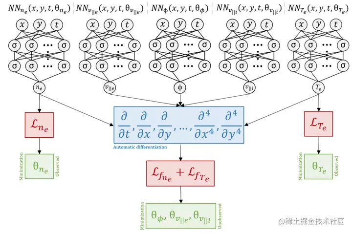 在深度学习框架中执行物理约束的理论,是通过自动微分,应用链式规则对输入时空坐标的神经网络进行微分,从而评估模型中的各个项来表示的。针对应用等离子体理论的优化是该方法的核心,并通过确保每个子网络尊重多场湍流模型的约束,在深度学习框架中强制实施物理约束。
