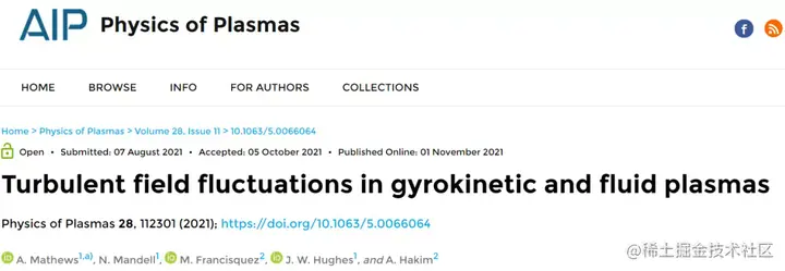 在发表于《Physics of Plasmas》的第二篇论文「Turbulent field fluctuations in gyrokinetic and fluid plasmas」中,Mathews 进一步研究了这种联系,并将其与更高保真度的湍流模拟进行了对比。这种首创的跨模型湍流比较以前很难(如果不是不可能的话)进行精确评估。Mathews 发现,在与现有聚变装置相关的等离子体中,简化流体模型的预测湍流场与高保真计算一致。从这个意义上说,简化湍流理论是有效的。该框架为减少全球等离子体湍流模型的数值验证和发现提供了一种新技术。