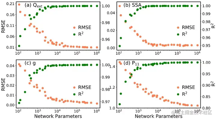此外,DNN 模型可以对数据库中不可用的形状参数或折射率进行高精度的粒子光学特性预测。重要的是,数据库大小的比率(∼127 GB)至DNN参数(∼20 MB)约为6810,这意味着 DNN 模型可以被视为一个高度压缩的数据库,可以作为原始数据库的替代品,用于实时计算辐射传输和大气模型中非球形粒子的光学特性。