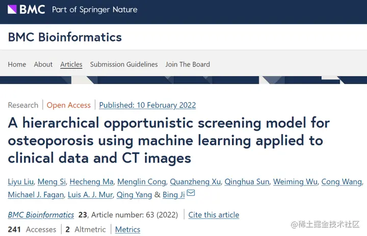 来自山东大学的研究团队提出了一个三层的分层模型,使用临床数据和覆盖腰椎的 CT 图像而不是通过机器学习的 DXA 数据来检测骨质疏松症。该研究以「A hierarchical opportunistic screening model for osteoporosis using machine learning applied to clinical data and CT images」为题,于 2022 年 2 月 10 日发表在《BMC Bioinformatics》上。