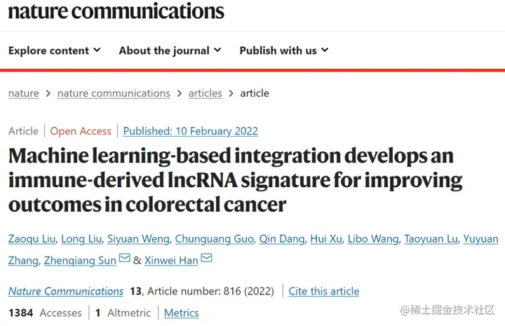 该研究以「Machine learning-based integration develops an immune-derived lncRNA signature for improving outcomes in colorectal cancer」为题,于 2022 年 2 月 10 日发表在《Nature Communications》上。