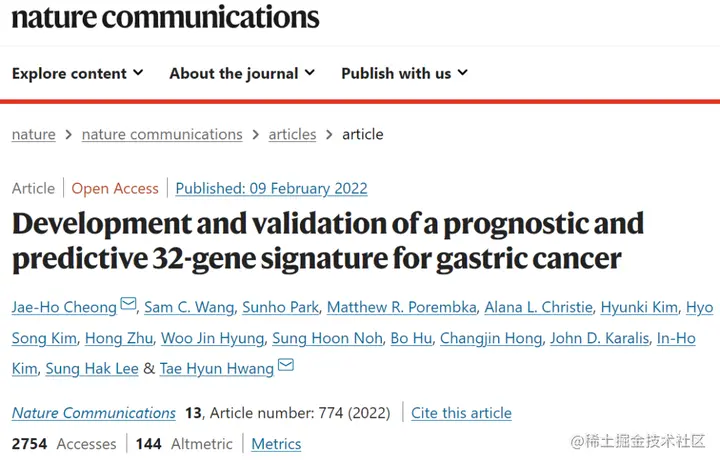 该研究以「Development and validation of a prognostic and predictive 32-gene signature for gastric cancer」为题,于 2022 年 2 月 9 日发表在《Nature Communications》上。