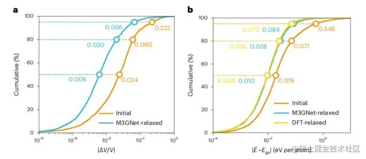 然后将 M3GNet IAP 应用于模拟材料发现工作流程,其中最终的 DFT 结构是先验未知的。M3GNet 松弛是对来自 3,140 种材料的测试数据集的初始结构进行的。M3GNet 松弛结构的能量计算产生每个原子 0.035 eV 的 MAE,并且 80% 的材料的误差小于每个原子 0.028 eV。使用 M3GNet 松弛结构的误差分布接近于所知道 DFT 最终结构的情况,这表明 M3GNet 潜力可以准确地帮助获得正确的结构。一般来说,M3GNet 的松弛会迅速收敛。