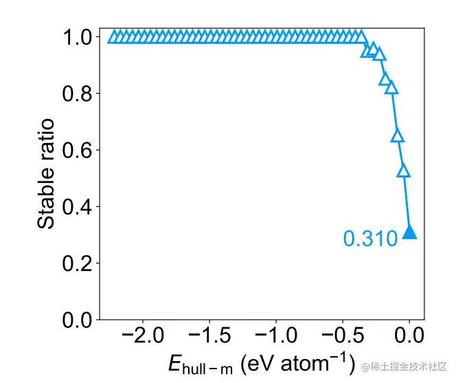 图 5:对于 1000 个结构的均匀样本,DFT 稳定比作为 Ehull−m 阈值的函数。(来源:论文)