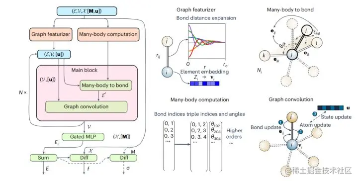 研究人员开发了一个明确包含多体相互作用的材料图架构。模型开发的灵感来自传统的 IAP,在这项工作中,将重点关注三体交互 (M3GNet) 的整合。