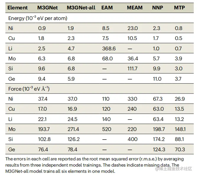 表 1:M3GNet 模型与现有模型 EAM、MEAM、NNP 和 MTP 在单元素数据集上的误差比较。(来源:论文)