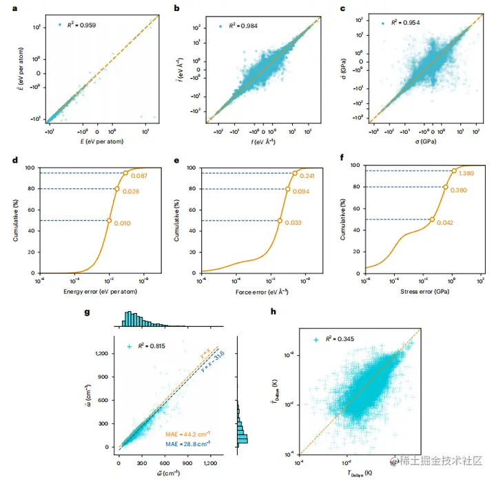 在测试数据上,模型预测和 DFT ground truth 匹配得很好,正如 DFT 和模型预测之间线性拟合的高线性度和 R2 值所揭示的那样。模型误差的累积分布表明,50% 的数据的能量、力和应力误差分别小于每个原子 0.01eV、0.033eVÅ−1 和 0.042 GPa。M3GNet 计算的德拜温度不太准确,这可归因于 M3GNet 对剪切模量的预测相对较差;然而,体积模量预测是合理的。