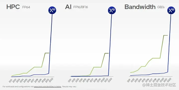 英特尔的现状以及 Ponte Vecchio 的发展方向。蓝线是英特尔,绿线是英伟达。(来源:nextplatform.com)