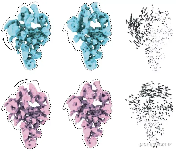 尽管这两种方法在使用深度学习来学习结构的集成方面相似,但它们在结构的表示方式上有所不同。Ellen D. Zhong 等人的研究,将表示保持为图像,网络学习从图像编码并解码为完整体积,直接将观察到的差异与体积联系起来。相比之下,Muyuan Chen 将体积表示为高斯分布的组合——球体加在一起形成结构的近似值——网络从图像编码,然后解码成具有不同位置和大小的球体列表。这简化了它们的表示,允许更容易地跟踪特定运动,同时允许关注特定区域或类型的变化;但在某些情况下可能会导致错误 ——例如,高度移动的区域可能永远不会被球体填充或可能使用的球体太少,很难准确描述小细节和小差异。
