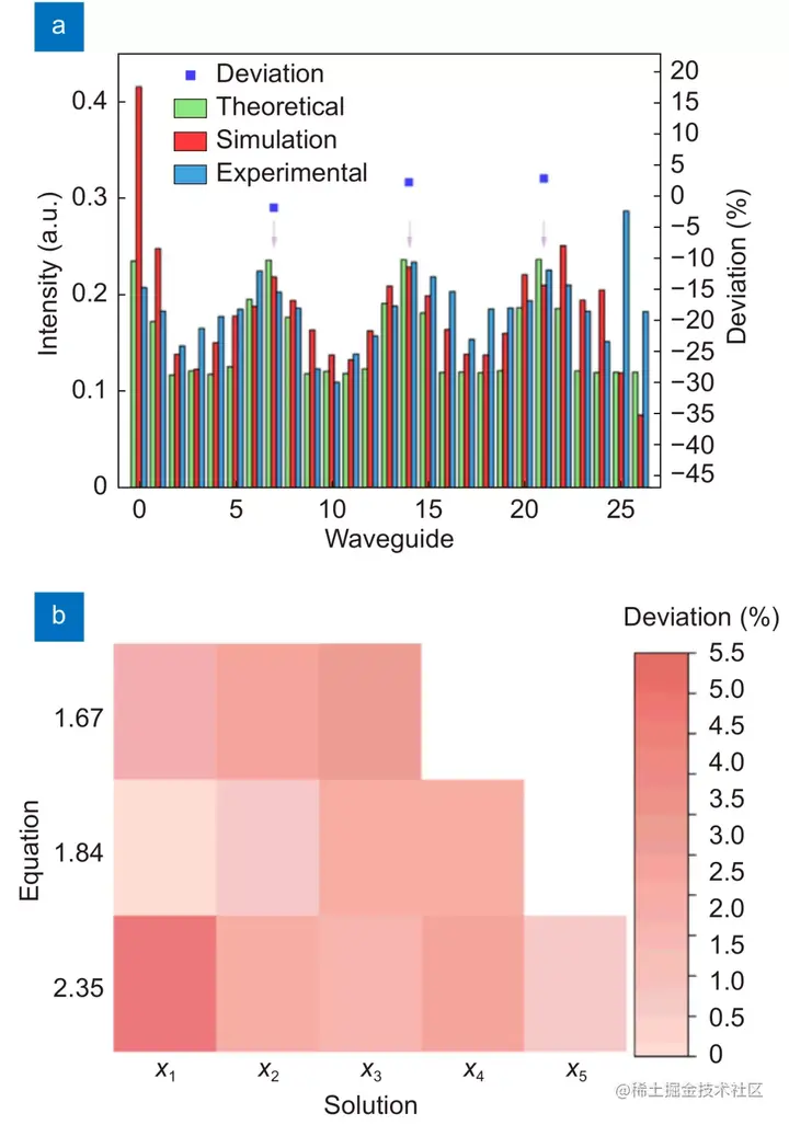 测试结果表明,本文提出的超越方程求解器具有较高的求解精度,最大偏差小于 5%,多数情况下偏差小于 3%。这种偏差是由于输出波导数量有限和样品制作不完善造成的。因此,需要强调的是,理论上可以通过增加输出波导的数量来提高求解的精度。
