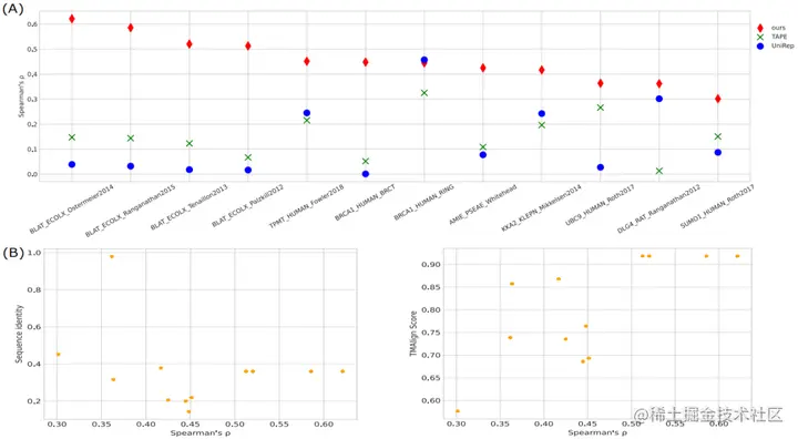 同时还可以注意到,该方法的性能与 DMS 测试蛋白和训练蛋白间的结构相似性相关,但与 DMS 测试蛋白和训练蛋白间的序列相似性无关。这进一步证实了零样本突变效应预测是使用了结构信息的。