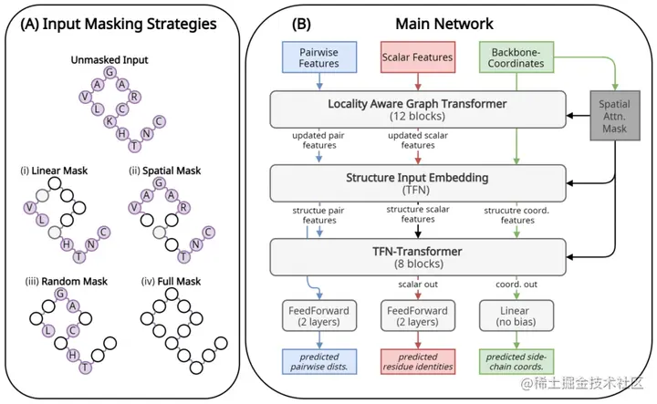 该架构由两个主要的子模块组成:12 层 Locality Aware Graph Transformer 和 8 层 TFN-Transformer。其中,Locality Aware Graph transformer利用蛋白质主干的几何形状来优化单个残基和残基对的特征表示,并将注意力限制在空间上相邻的残基对。该模块的输出和蛋白质主干坐标一起被传递到下一个模块 TFN transformer,该模块为每个输入残基产生侧链构象和氨基酸类型。这些模块的详细信息在许教授另一篇文献中有完整描述,下面给出了示意图。