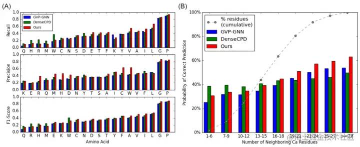 研究人员在四个测试集( CASP13、CASP14、CATH4.2 和 TS50)上比较了几种现有的逆向折叠方法,表明新方法在所有数据集上具有明显更高的天然序列恢复率(NSR)。