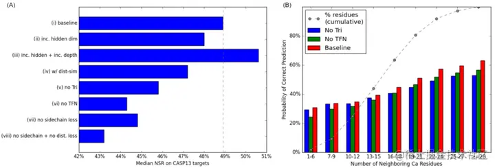 在上图中,可以看到从损失函数中移除侧链 RMSD (vii) 和预测的侧链原子之间的成对距离 (viii) 显著降低了 CASP13 测试蛋白上的 NSR。在默认损失函数保持不变的情况下,移除 TFN-Transformer 对 NSR 的影响最大,当该组件被消融时,NSR 下降了近 5 个百分点。