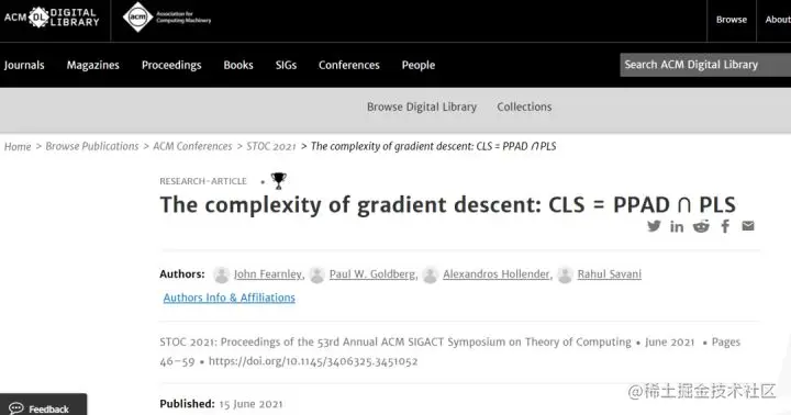 研究成果《The complexity of gradient descent: CLS = PPAD ∩ PLS 》获得 6 月份的 2021 年度 ACM 计算理论研讨会 (STOC) 最佳论文奖。