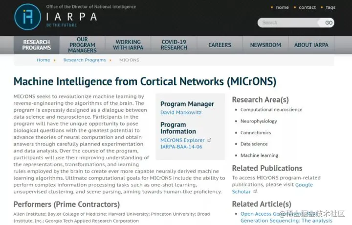 大脑皮层网络的机器智能计划(MICrONS) 作为奥巴马「脑计划」(BRAIN Initiative)的一部分,MICrONS 项目旨在逆向设计一立方毫米的大脑,研究大脑的计算方式,并将研究结果更好地应用于机器学习和人工智能算法。当时,IARPA 招募了三个团队,每个团队都为这个难题提出了自己的五年研究规划。