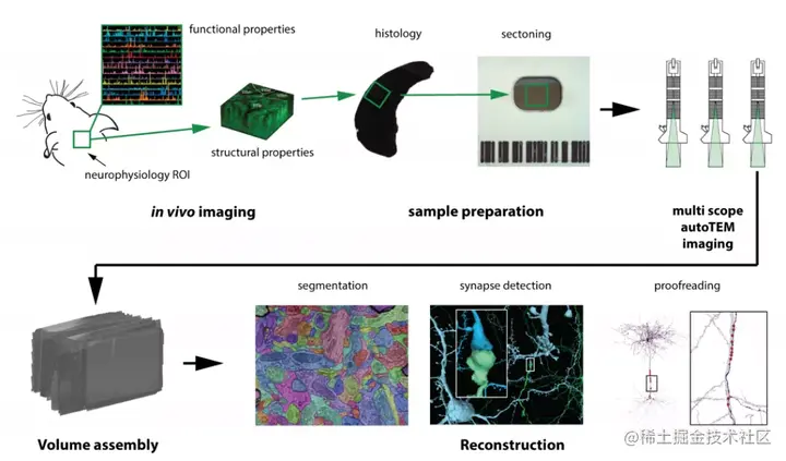 在 Baylor 实验之后,艾伦研究所的研究人员保存并切片了 27,000 多个切片,每个切片只有 40 纳米厚,使用定制的电子显微镜捕获了总共 1.5 亿张这些切片的图像。切割过程昼夜不停地进行了 12 天,在此期间,生物学家、工程师和软件开发人员的团队轮班值班,准备在切割出错时立即停止并重新启动仪器。