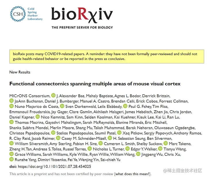 该研究以《Functional connectomics spanning multiple areas of mouse visual cortex》为题,于 7 月 28 日发表在 biorxiv 预印本平台。