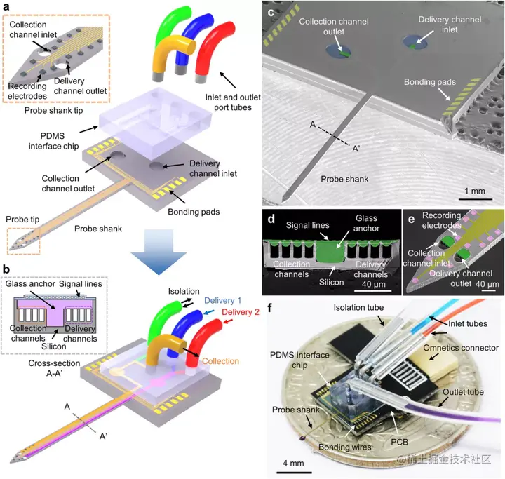 探针只有 40 微米厚,横截面积是先前制造的探针周长的三分之一甚至四分之一——这可以最大限度地减少插入大脑期间的组织损伤。该设备还具有连接到探针的微流体接口芯片,用于将药物输送到指定位置。