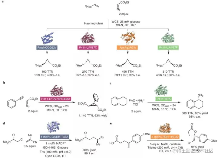 在该系统中,胺化被认为是通过“未受保护的”铁氮氧化物活性位点中间体进行的,该中间体可以被认为是化合物 I 的氮类似物。在 Hyster 团队研究的 α-酰基自由基和烯烃的加氢烷基化反应中,活性位点中的底物活化是通过自由基前体、烯烃、黄素辅因子和蛋白质支架之间罕见的四元电荷转移复合物实现的,这使得立体感应能够通过具有挑战性的氢原子转移步骤。