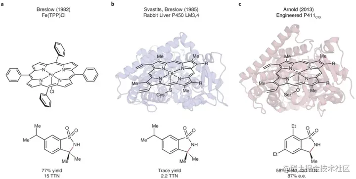 只要能够鉴定出一种能够进行所需的从新到自然的转化的酶,就应该有可能指导其进化,将低产、混杂的酶活性详细说明为稳健和高效的生物催化。因为在人类友好的时间尺度上的进化可用于追踪生物活动,在 Breslow 和 Gellman 最初研究酶促氮烯转移近 30 年后,工程酶现在进行高度立体选择性的 C-H 胺化反应,TTN 值为数百到数千 。