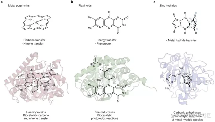 在大多数这些例子中,仅使用基因编码的酶促机制来识别新活性。人造金属酶领域不断发展,其中开发了新的过渡金属辅助因子以赋予酶新的活性,一旦开发出强大的组装和定向进化方法,有望进一步扩大生物催化剂的反应空间。