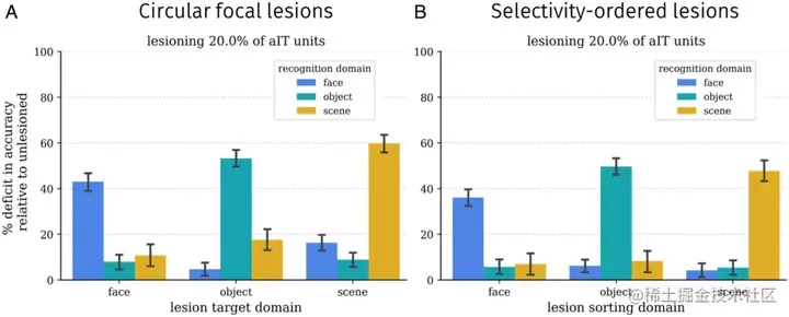 接下来,研究人员在模型中进行了一系列损伤分析,以与面部和物体识别的神经心理学数据进行比较。首先,做了局灶性病变。