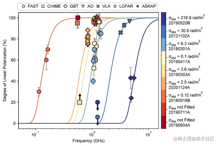 整体来看,重复暴的线偏振度存在随频率降低而降低的统一趋势,并且这种频率演化关系可以通过单一参数「RM 弥散」量化描述,这排除了通道内混淆(intra-channel depolarization)、基于辐射区磁层高度变化的脉冲星偏振内禀频率演化(intrinsic frequency evolution)模型等其他解释。