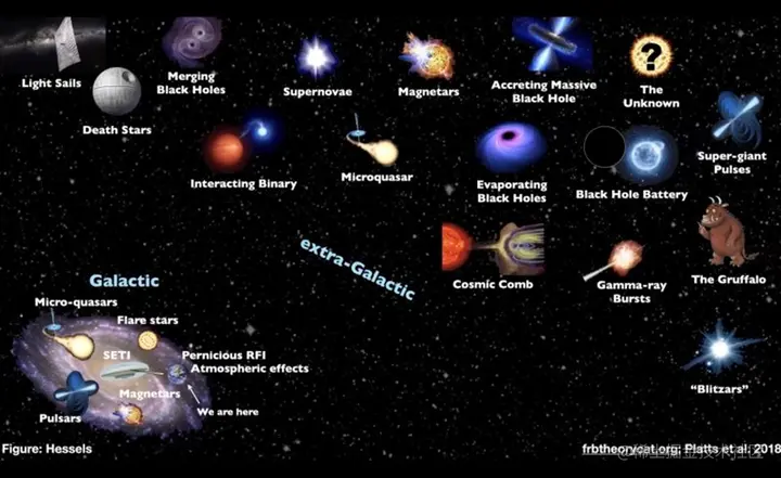 对于这个宇宙深处「神秘信号」的起源,科学家们有很多理论推测——磁星巨耀发、脉冲星的巨脉冲、中子星穿越小行星带、双黑洞并合……这些会产生巨大能量的天体活动都被认为是快速射电暴的可能起源。