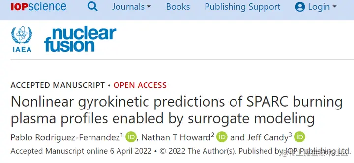 该研究工作以「Nonlinear gyrokinetic predictions of SPARC burning plasma profiles enabled by surrogate modeling」为题,发表在《Nuclear Fusion》杂志上。