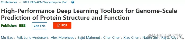 该研究以「High-Performance Deep Learning Toolbox for Genome-Scale Prediction of Protein Structure and Function」为题,于 2021 年 11 月 15 日在《2021 IEEE/ACM 高性能计算环境中的机器学习研讨会 (MLHPC) 》上发布,于 2021 年 12 月 27 日添加在《IEEE Xplore》。