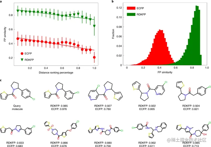 MolCLR 学习了具有相似拓扑结构和官能团的分子的紧密表示。例如,顶部显示的三个分子具有与芳基连接的羰基。左下角显示的两个分子具有相似的结构,其中一个卤素原子(氟或氯)与苯相连。这说明即使没有标签,该模型也会学习分子之间的内在联系,因为具有相似特性的分子具有相似的特征。