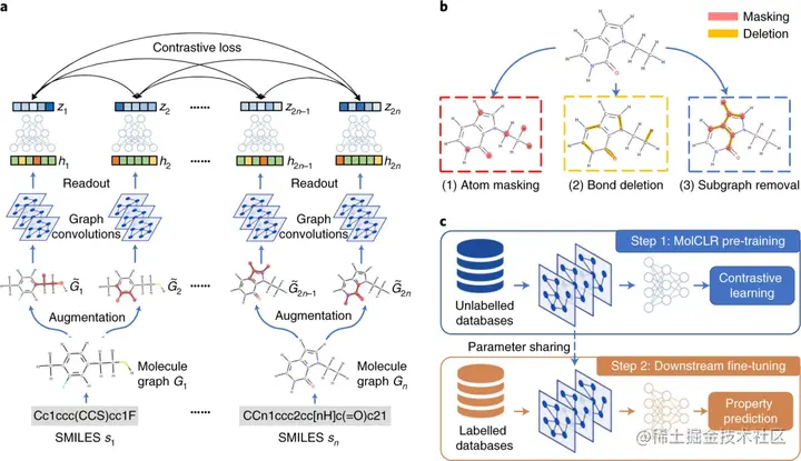在 MolCLR 预训练中,构建分子图并开发图神经网络编码器来学习可微表征。提出了三种分子图增强策略:原子掩蔽、键删除和子图删除。