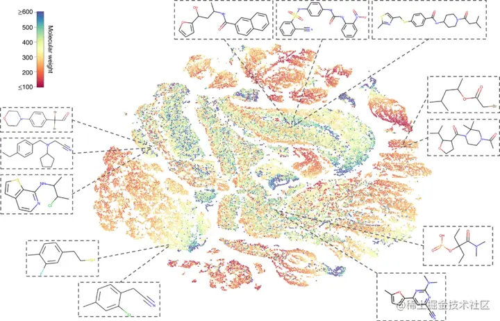 研究人员使用 t-SNE 嵌入检查由预训练的 MolCLR 学习的表示。t-SNE 算法将紧密的分子表示映射到 2D 中的相邻点。