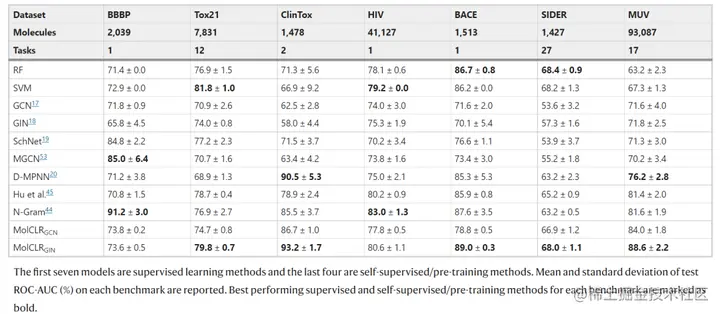 为了证明 MolCLR 的有效性,研究人员对来自 MoleculeNet 的多个具有挑战性的分类和回归任务的性能进行了基准测试。