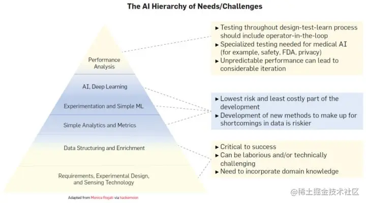缺乏对数据工程的投资是缺乏适当数据集的部分原因。人工智能技术的进步往往掩盖了支持和确保其成功的计算基础设施要求。AI 社区将这种规范的基础设施称为需求金字塔(参见图 5),其中数据工程是一个重要组成部分。数据工程封装了实验计划、数据收集、结构化、访问和探索步骤。