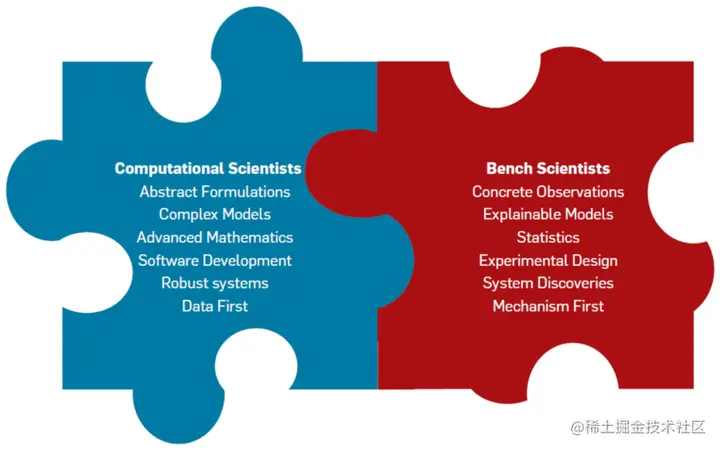 计算科学家和实验科学家的训练方式截然不同(见图 7)。通过培训,计算科学家倾向于专注于抽象,热衷于自动化和计算效率以及颠覆性方法。他们自然倾向于任务专业化,并寻找将重复任务交给自动化计算机系统的方法。替补科学家很实用,接受过具体观察方面的培训,并且更喜欢可解释的分析来准确描述实验的具体结果。