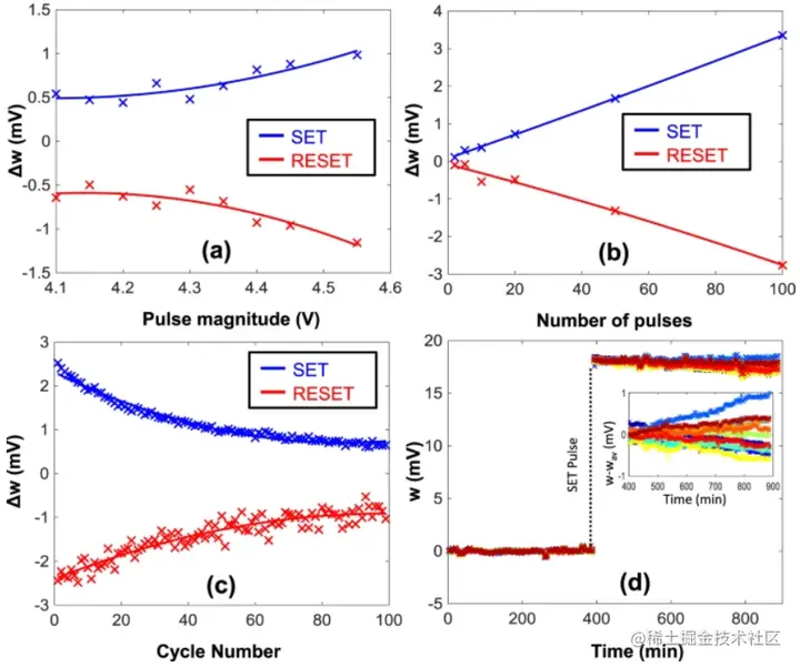 由于在 SET 和 RESET 期间,存储在浮栅上并穿过隧道势垒传输的有限数量的电子产生的另一个限制是编程速度。较短持续时间的编程脉冲将减少存储电压(权重)的变化,如果需要更新精度,这可能是有益的。相反,通过增加编程脉冲的幅度,可以粗略地调整存储电压的变化。但是,这将限制权重饱和之前的更新次数。当然,由于设备不匹配,不同 FN-DAM 设备上的编程值会有所不同。