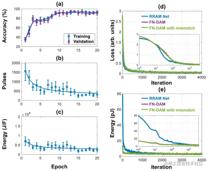 在训练阶段,存储在 FN-DAM 上的权重本质上是可塑性的,并根据梯度下降训练收敛所必需的学习率演化而衰减。随着训练阶段过渡到推理阶段,FN-DAM 充当非易失性存储器。因此,训练后的权重可以持久存储,无需任何额外的刷新步骤(用于易失性嵌入式 DRAM 架构)。