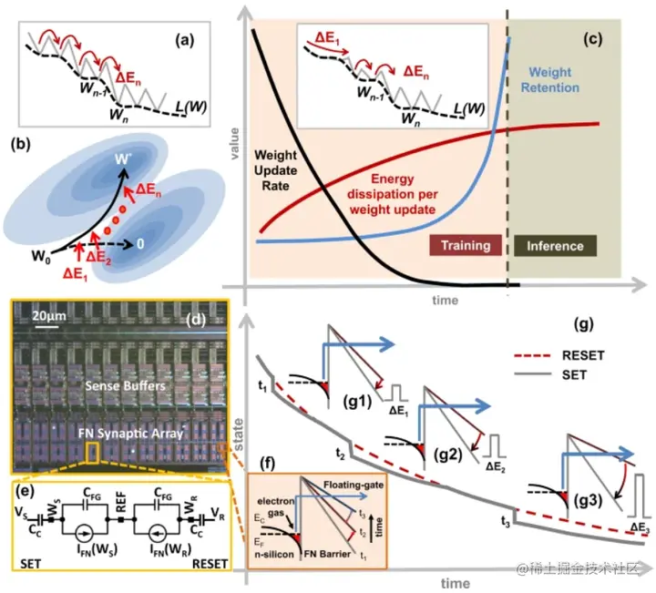 一种学习/训练算法,以量化步长 (…,Wn−1, Wn, Wn+1, …) 调整存储的权重,以最小化系统级损失函数 L(W),如图 1 所示 , 必须消耗 (..., ΔEn−1, ΔEn, ΔEn+1, ...) 的最小能量以进行内存更新。通过能量屏障分离静态还允许学习算法精确控制后续参数更新之间的参数保留时间(参数泄漏),但是,这种更新模式没有利用学习的物理特性来优化能量效率。