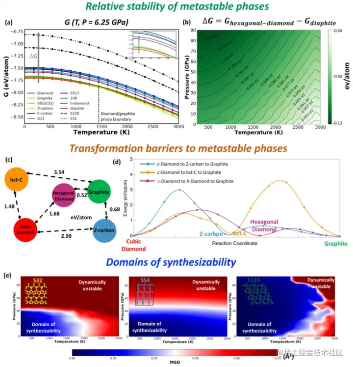 研究人员构建了一个离散的热力学图表示(上图 c),其中节点代表各个相,边缘的长度与转换障碍成正比。基于该图,研究人员发现石墨到 Z-碳相与立方金刚石到 Z-碳相的转变势垒较低,这表明石墨是实现 Z-碳亚稳相的优选起始材料。另一方面,立方金刚石是形成 bct-C 的相对更好的起始材料。