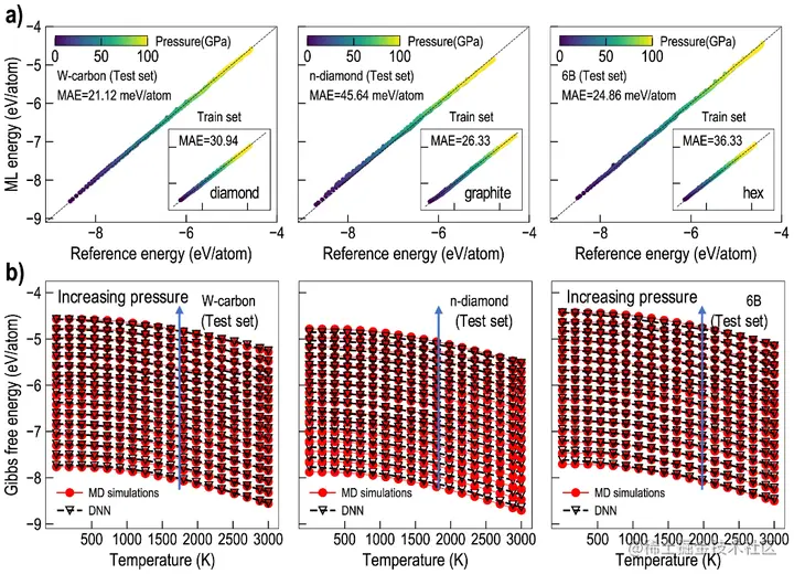 使用基于 ML 的代理模型,可以加速该过程,并且可以构建预测 G(T,P) 的代理模型。下图展示了仅给定 SOAP 描述符形式的结构信息,经过训练以预测 G(T,P) 的 DNN 模型的性能。图中的奇偶校验图展示了 DNN 模型在训练集和测试集上实现的预测精度(平均绝对误差,MAE)。值得注意的是,n-diamond (S291)、S455 和 6B (S389) 数据是测试集的一部分,这些情况下良好的 DNN 性能说明了它能够捕获碳的自由能表面。