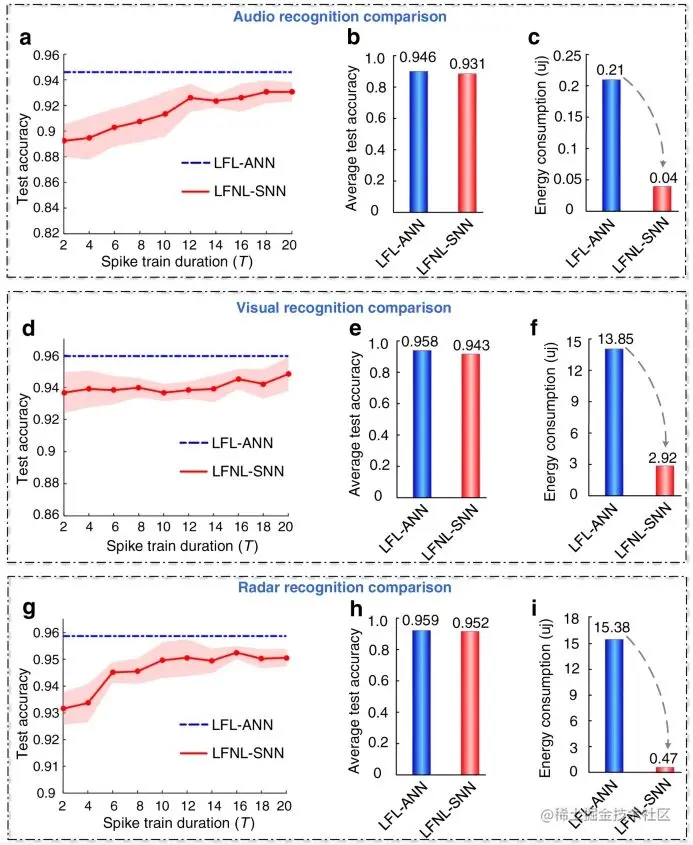 图示:在音频、视觉和雷达数据集上训练的 ANN 和 SNN 之间的识别精度和计算能量比较。(来源:论文)
